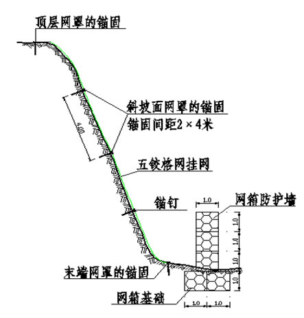 在有些不稳定的岩质山坡下的建筑物存在地质威胁,为了减小原来岩质山坡对建筑和一些设施的潜在威胁,需要对岩质山坡进行防护。在满足工程需要的情况下考虑到与环境生态的效果。在有岩石突出的山坡下面采用挡墙形式。石头可以就近取材,生态石笼网采用高镀锌钢丝外包PVC材料,PVC覆层采用灰色以便与环境相和谐。山坡下的网箱结构可以有效阻挡突出岩石山坡落下的碎石和滑土,同时格网结构就近取石材,结构与环境融为一体。生态格宾网结构对基础要求不高,而且便于施工,施工速度快,造价低。安装过程中将多个网箱或网垫绑扎在一起,形成一个均匀的结构,整体性好,能抵挡落石对挡墙结构的冲击。