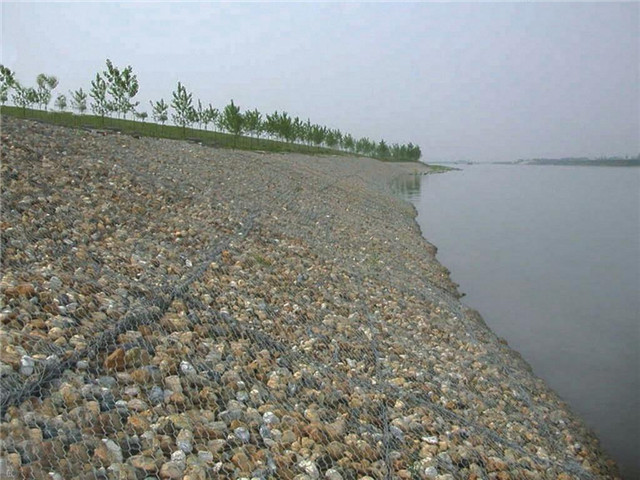 雷诺护垫系采用以机编六边形低碳钢丝网面制成的网垫,在网垫内填充合乎一定要求的石头共同构成的防护结构,钢丝表面处理采用镀锌+覆塑双重防腐。一般的雷诺护垫的规格为0.3m厚,2m宽,6m长。